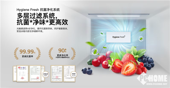 该系列冰箱同步搭载Hygiene Fresh+抗菌净化系统,通过光触媒和UV光波照射、4步精密过滤,强力主动吸附风机,让冰箱的温度控制在上下0.5度,尽可能保证冰箱内食物的新鲜。经中国家用电器检测以大肠埃希氏菌、金黄色葡萄球菌为测试对象,抗菌率高达99.99%,异味净化效果达到90%以上。
